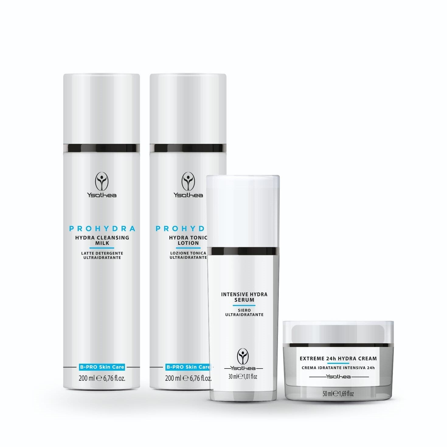 HIDRA CLEANSING MILKLatte Detergente Ultraidratante 200 ml.HIDRA TONIC LOTIONLozione Tonica Ultraidratante 200 ml.INTENSIVE HIDRA SERUMSiero Ultraidratante 30 ml.EXTREME 24h HIDRA CREAMCrema Idratante Intensiva 50 ml.